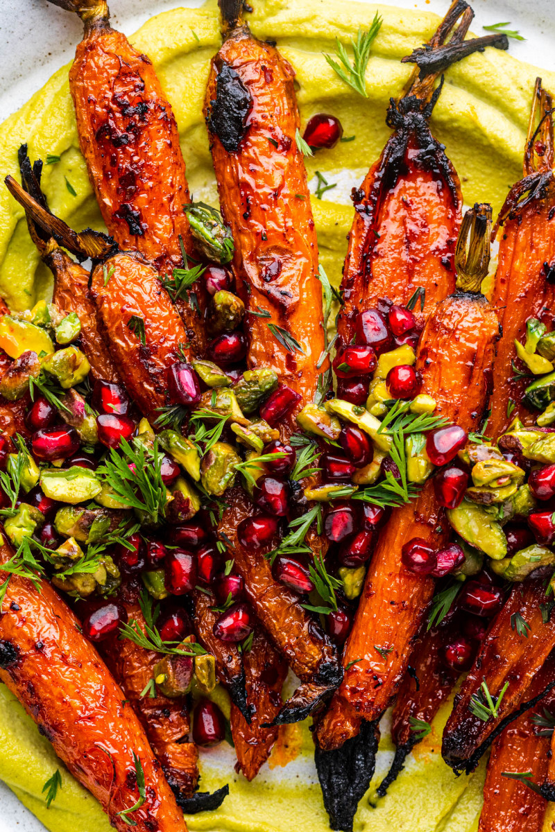 - Spread pistachio cream on a platter, pile roasted carrots on top. Decorate with pomegranate arils, chopped pistachios and a handful of chopped carrot tops or parsley and/or mint.